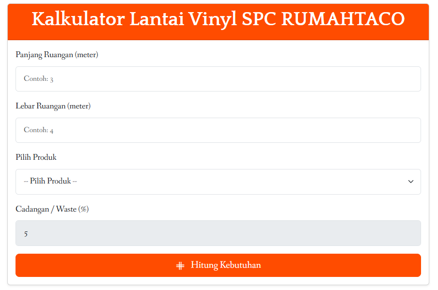 Tidak perlu hitung manual lagi. Gunakan Kalkulator Lantai Vinyl kami untuk hasil yang lebih cepat dan akurat.