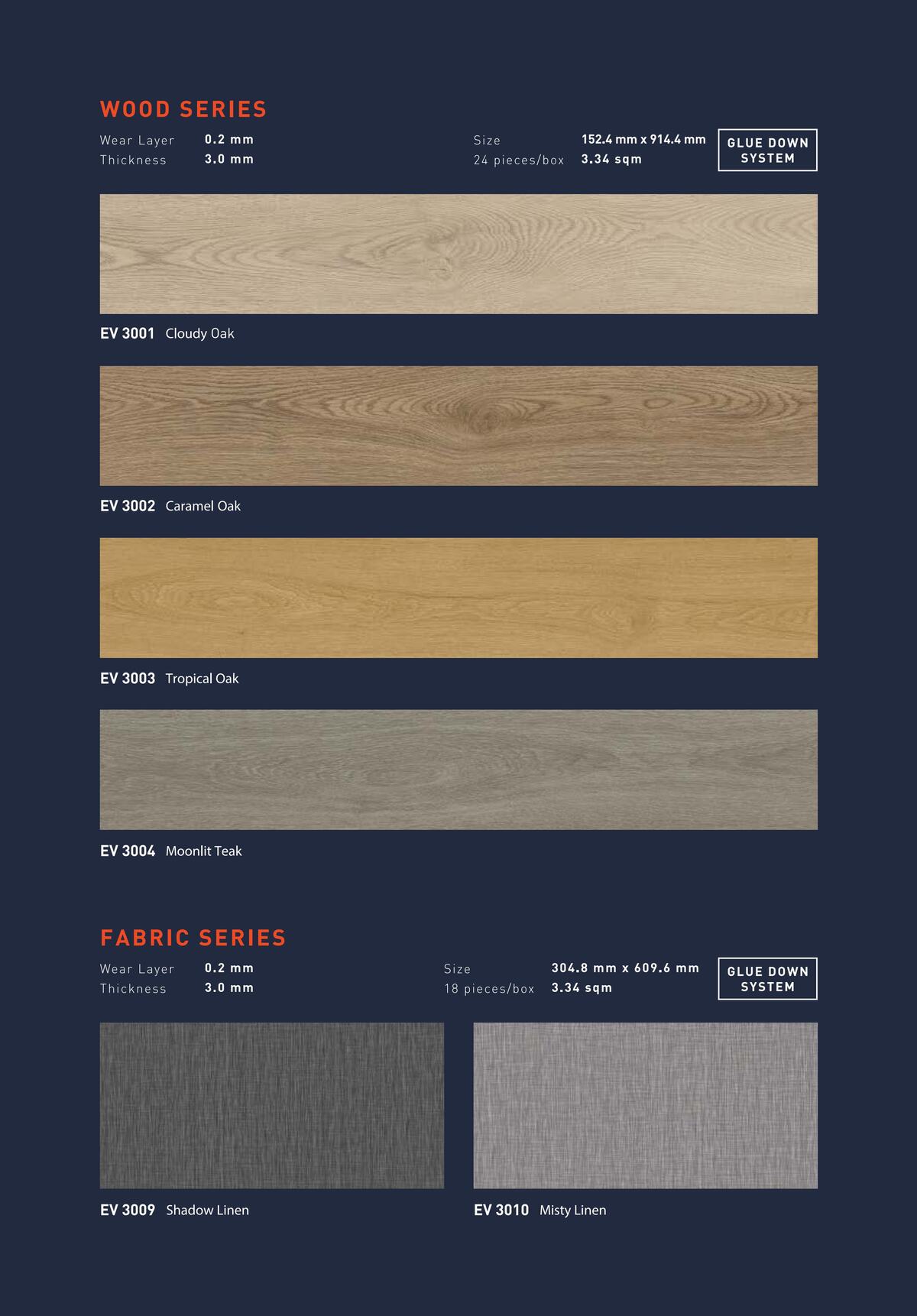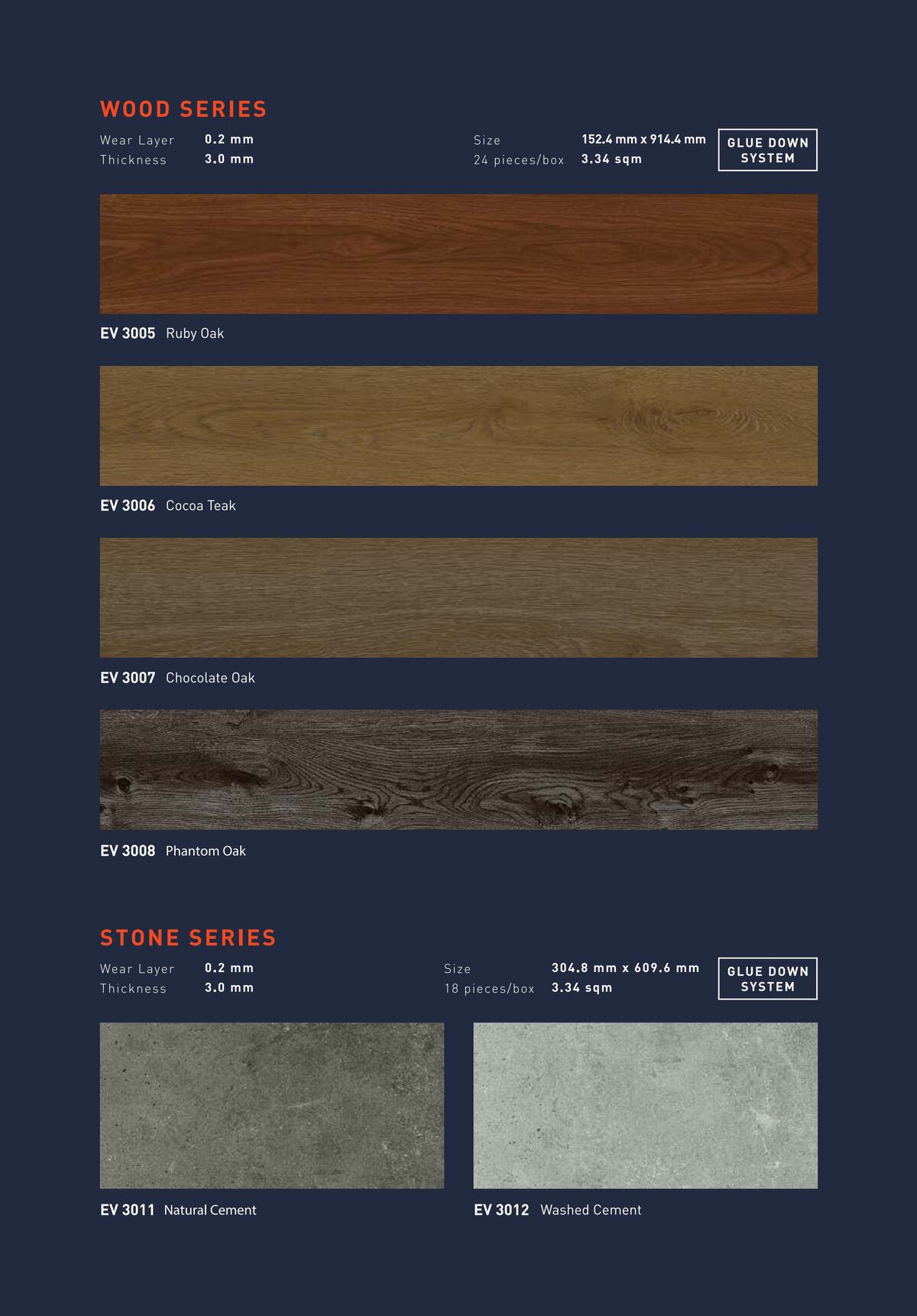 Semua seri menggunakan metode pemasangan glue down (dengan lem) dan tersedia dalam kemasan 3.34 m² per box. Unduh Katalog ECO Flooring Super Vinyl Plank (PDF) untuk melihat pilihan warna, tekstur, dan spesifikasi lengkap setiap motif.